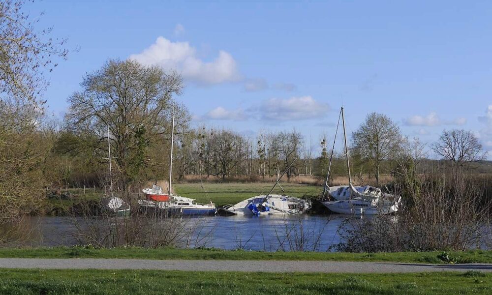 Le long de la promenade du Chemin sous la marée, vers la Croix des Marins, on voit que les bateaux qui séjournaient ici pendant les inondations et les tempêtes ne se présentent pas tout à fait comme d’habitude…